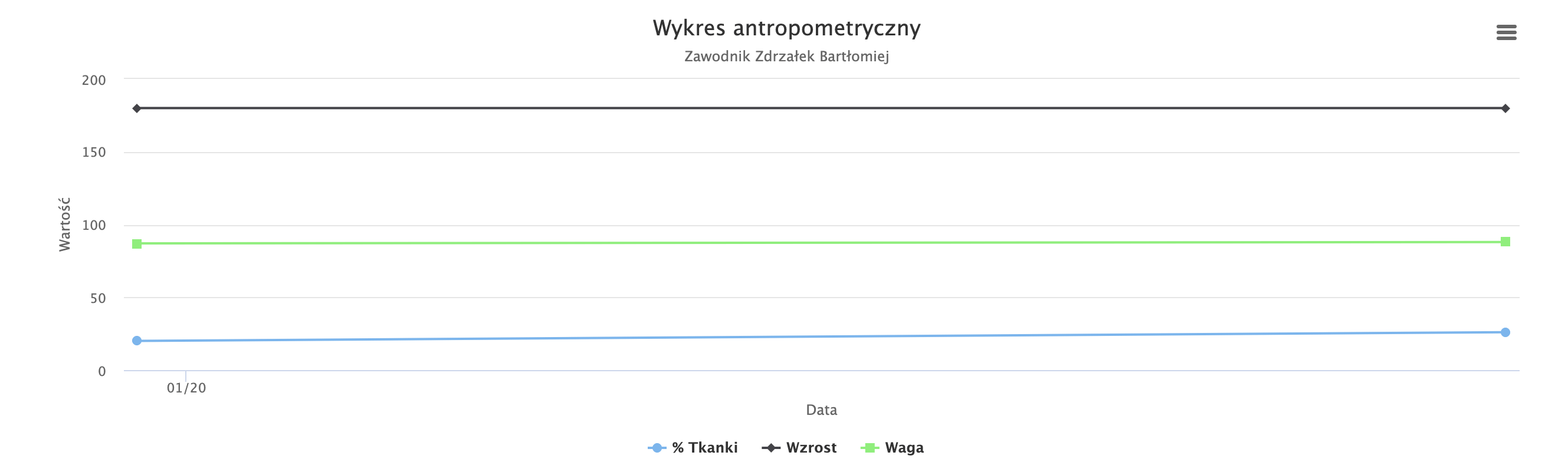 Pierwszym krokiem przed wprowadzeniem danych jest wybranie daty pomiaru. Następnie do uzupełnienia masz trzy pola: wzrost, waga oraz procent tkanki tłuszczowej. Na podstawie tych danych, płci oraz wieku zawodnika obliczane jest automatycznie BMI i BMR. Ważną kwestią jest fakt, że dane te idą za zawodnikiem przez wszystkie lata wprowadzania danych do systemu i przedstawiane są w postaci wykresu liniowego, dzięki czemu jesteś w stanie śledzić rozwój fizyczny zawodnika na przestrzeni lat, w których dokonywane były pomiary.
